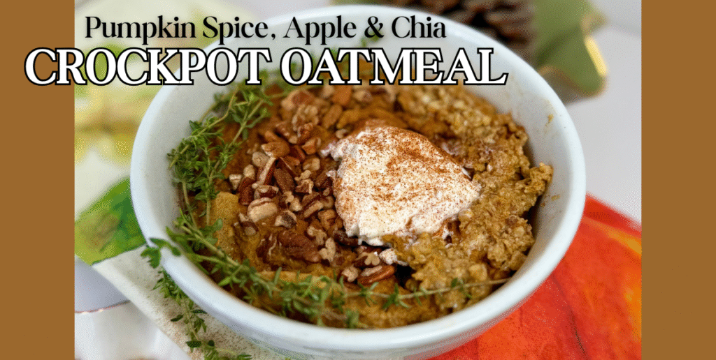 This easy Pumpkin Spice, Apple & Chia Crockpot Oatmeal is the perfect healthy fall breakfast. Made with rolled oats, pumpkin purée, apples, and chia seeds, it cooks overnight for a warm, fiber-packed, and naturally sweet start to your morning. A simple slow cooker recipe that’s cozy, nutritious, and family-friendly.